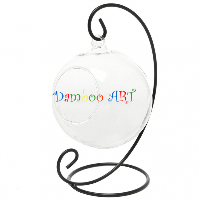 Globul din sticla cu suport este ideal pentru realizare decoratiuni cu licheni, flori si/sau plante stabilizate. Este realizat din sticla transparenta, cu suport metalic negru, care va ofera posibilitatea sa-l decorati dupa cum doriti.