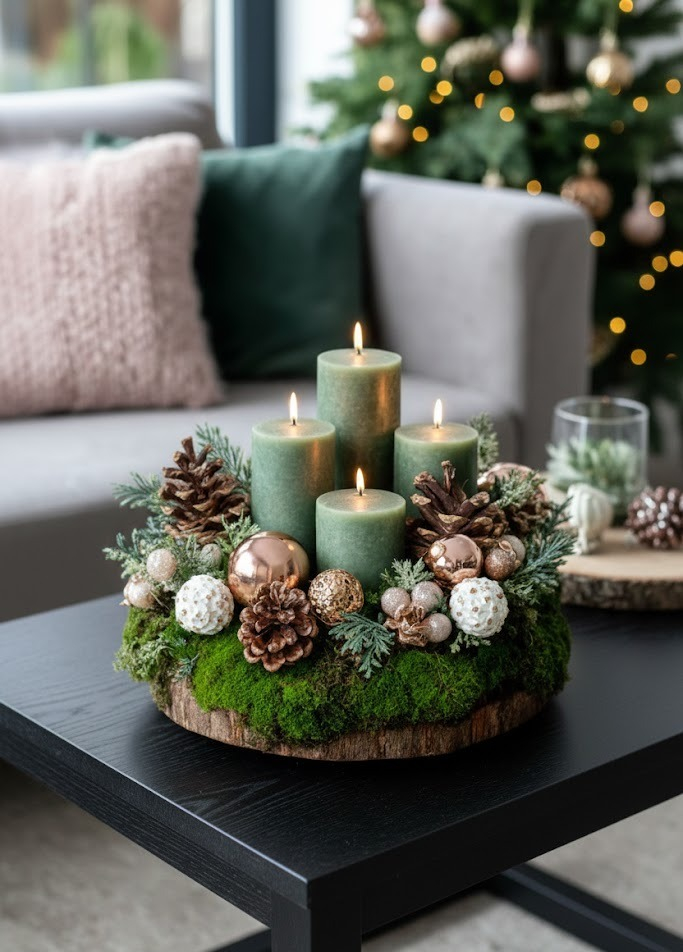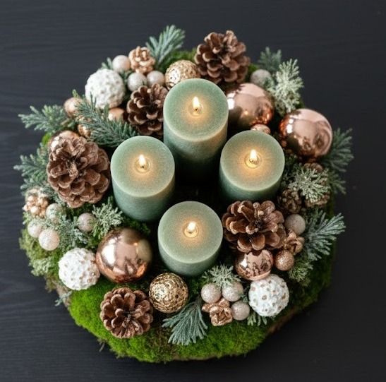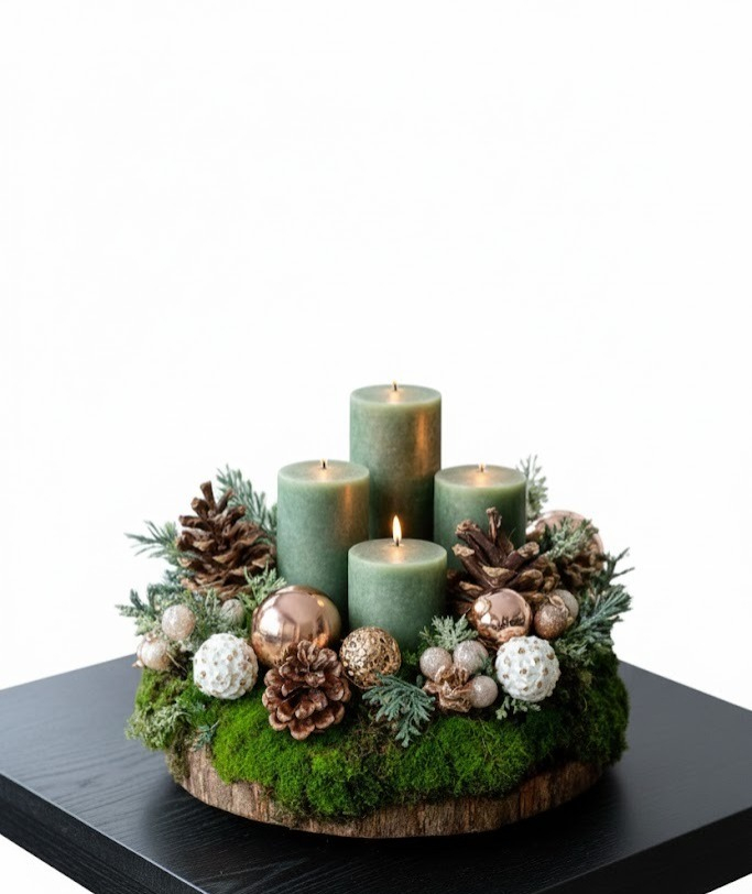 O decorțiune unică de iarnă, realizată pe o felie naturală din lemn, îmbogățită cu mușchi natural stabilizat și patru lumânări verzi ce transmit echilibrul și liniștea naturii. Elemente naturale, albe și aurii completează decoratiunea cu rafinament și lumină, creând un decor elegant, cald și perfect pentru atmosfera sărbătorilor.