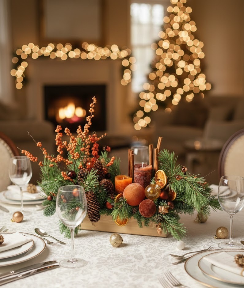 O decorațiune caldă și naturală, cu brad, conifere parfumate și accente orange, ce aduce lumină,armonie și echilibru.