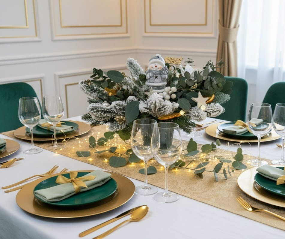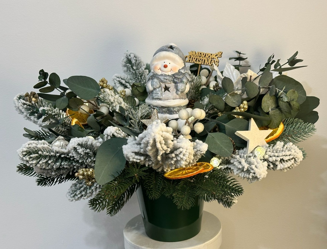 Aceasta decoratiune rafinata aduce BUCURIA CRACIUNULUI direct în casa dumneavoastră. Realizata cu ramuri naturale stabilizate de eucalipt, crengi de brad acoperite delicat cu zăpadă artificială si elemente decorative naturale special pentru a te transpune intr-o atmosferă de iarnă feerică. Accentele aurii, fructele uscate de portocală și steluțele decorative completează armonios paleta cromatică, adăugând o notă de eleganță și căldură. Perfect pentru a decora masa de sărbătoare, biroul sau orice colț al casei, acest aranjament este creat să aducă zâmbete, bunastare și bucurie în sufletele celor dragi.